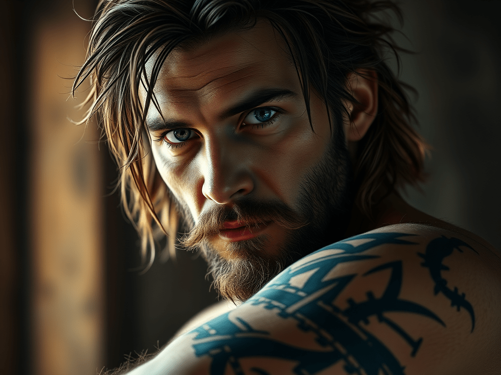 He was danger dressed in comfort, seduction laced with restraint. His eyes were a piercing blue, the kind that held storms behind silence, beautiful, unreadable. A mustache and beard framed his mouth with rugged softness, like he hadn’t shaved on purpose but still looked like art. And that long hair… wild, messy, almost feral, like it refused to be tamed just like him. I loved running my fingers through it, especially when he let his guard down, when he closed his eyes and leaned into my touch like maybe, just maybe, love didn’t scare him in that moment.
